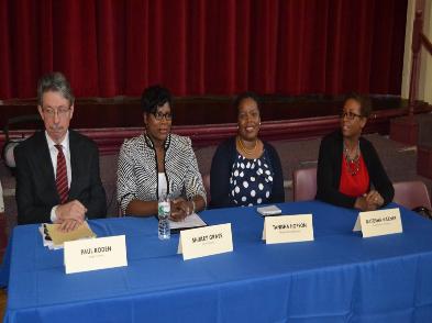 | Closing Plenary Speakers discussing youth Career Action Planning. Left to right: Paul Roden, LaSalle University, Shirley Grass, Drexel University, Tanisha Hopson, Optimal Living Magazine, and Natosha R. Warner, FBI. |