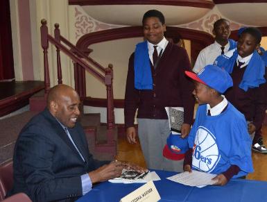 | NBA legend and former Philadelphia 76ers teammate, Ollie Johnson, surprises students with Sixers swag after his breakout session on careers in sports. |